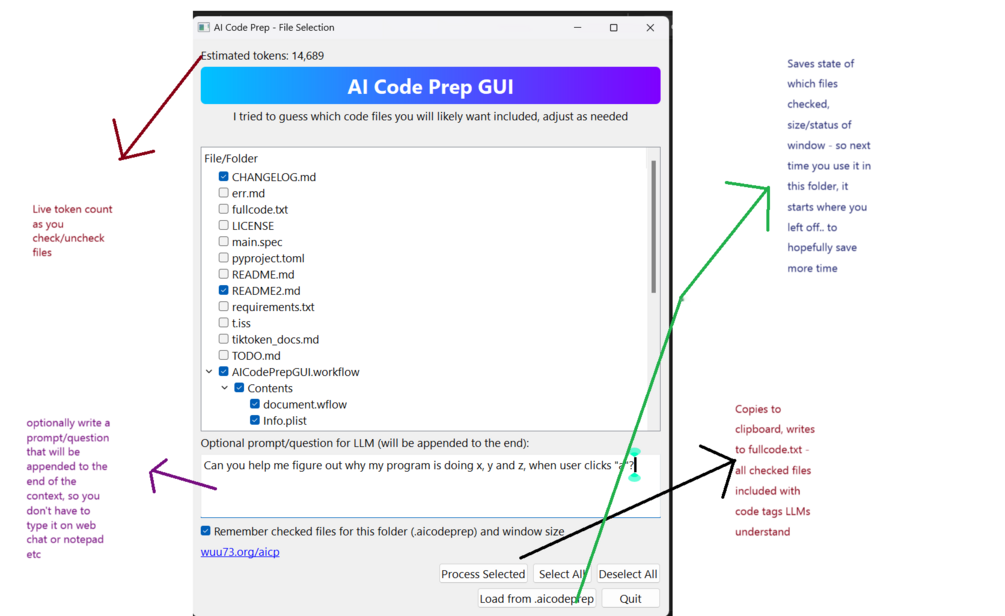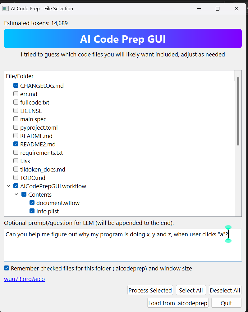 - Saves an .aicodeprep file with the files you last had checked in that folder, plus your window size / adjustment preferences. This helps when you need to keep grabbing the code / context often for the same project. I hated having to click the same boxes over again so it's a great feature.