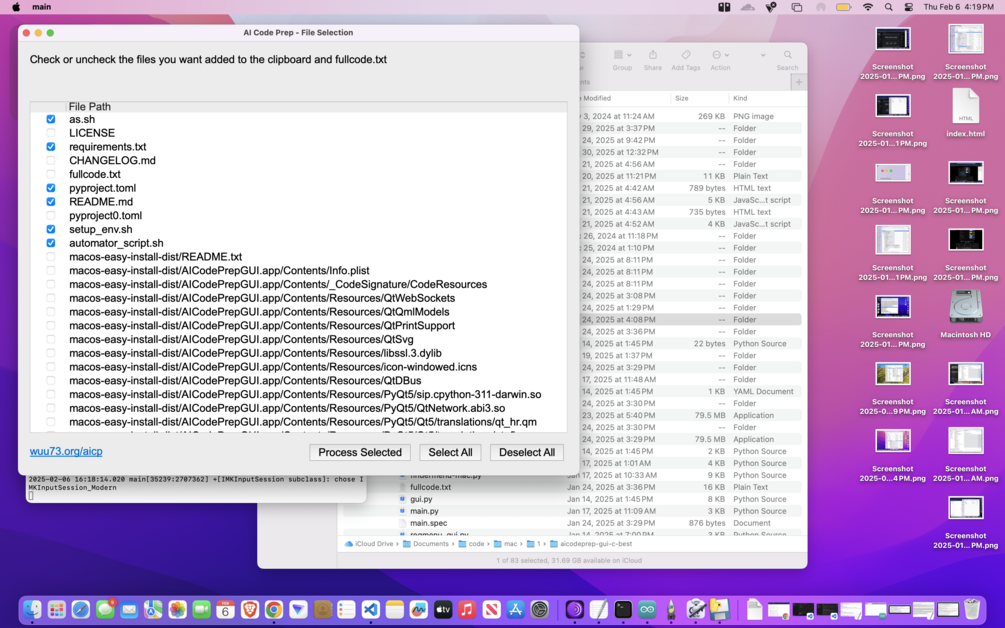 6. Click Process Selected which will copy it all to clipboard and save it to fullcode.txt. Paste into LLM chat